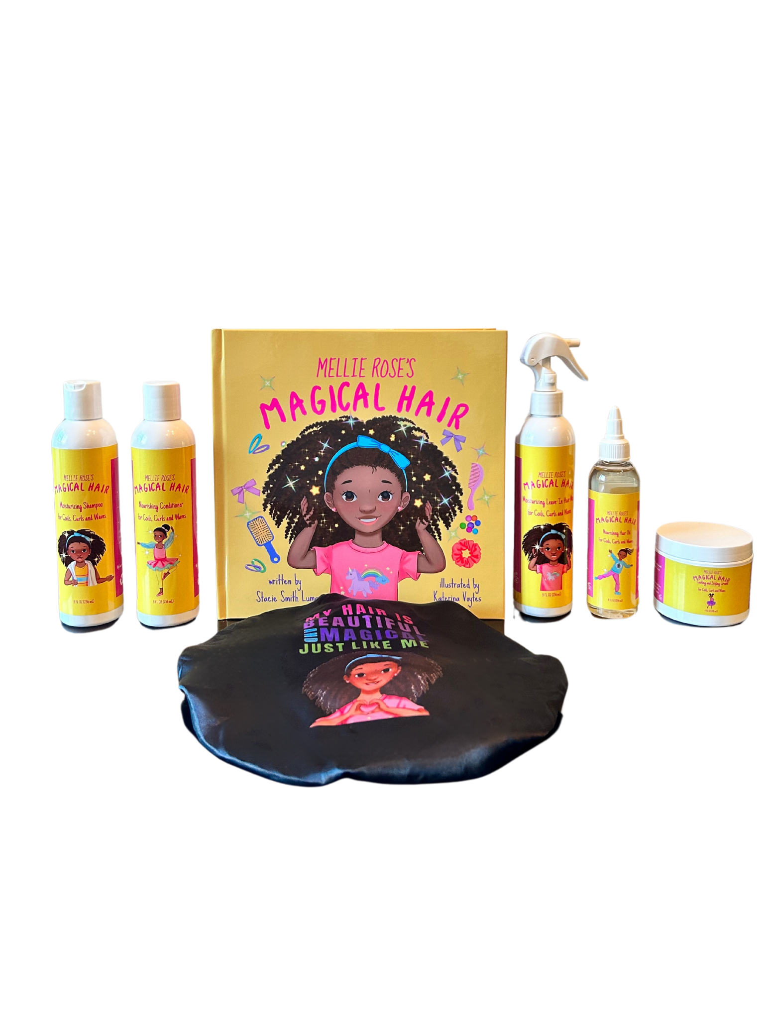 This bundle includes a signed hardcover copy of the Mellie Rose's Magical Hair book, our kid's satin bonnet and our Wash Day Kit.